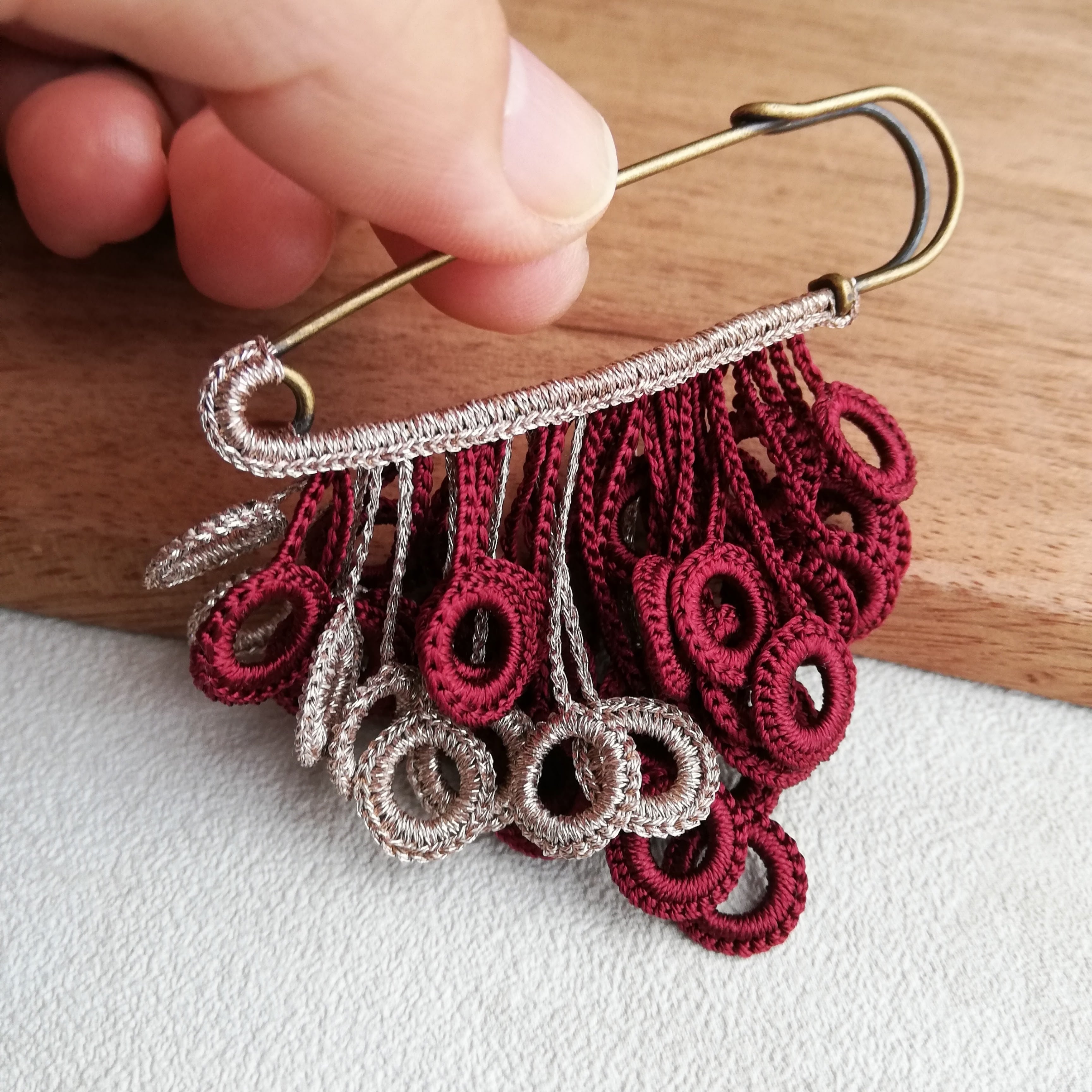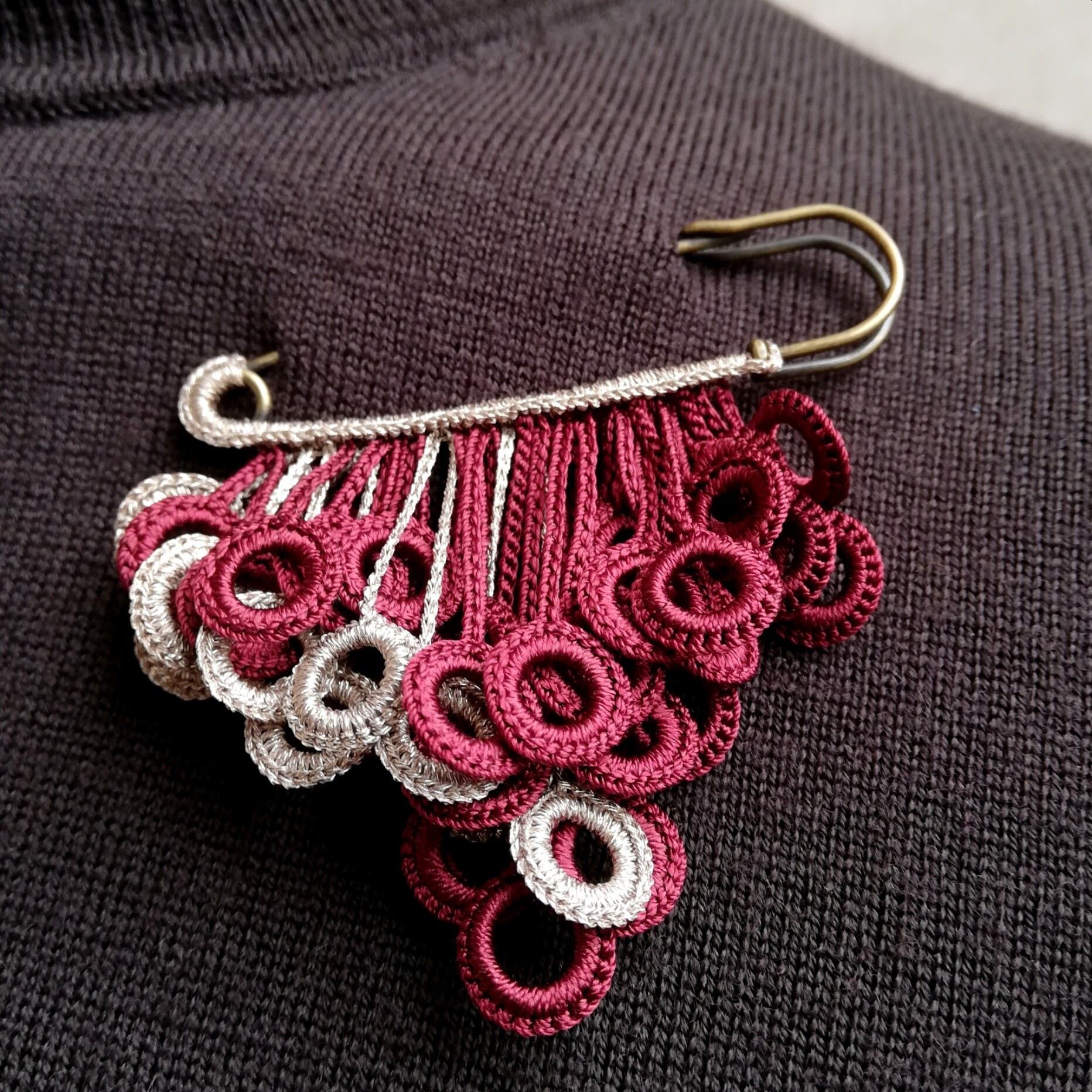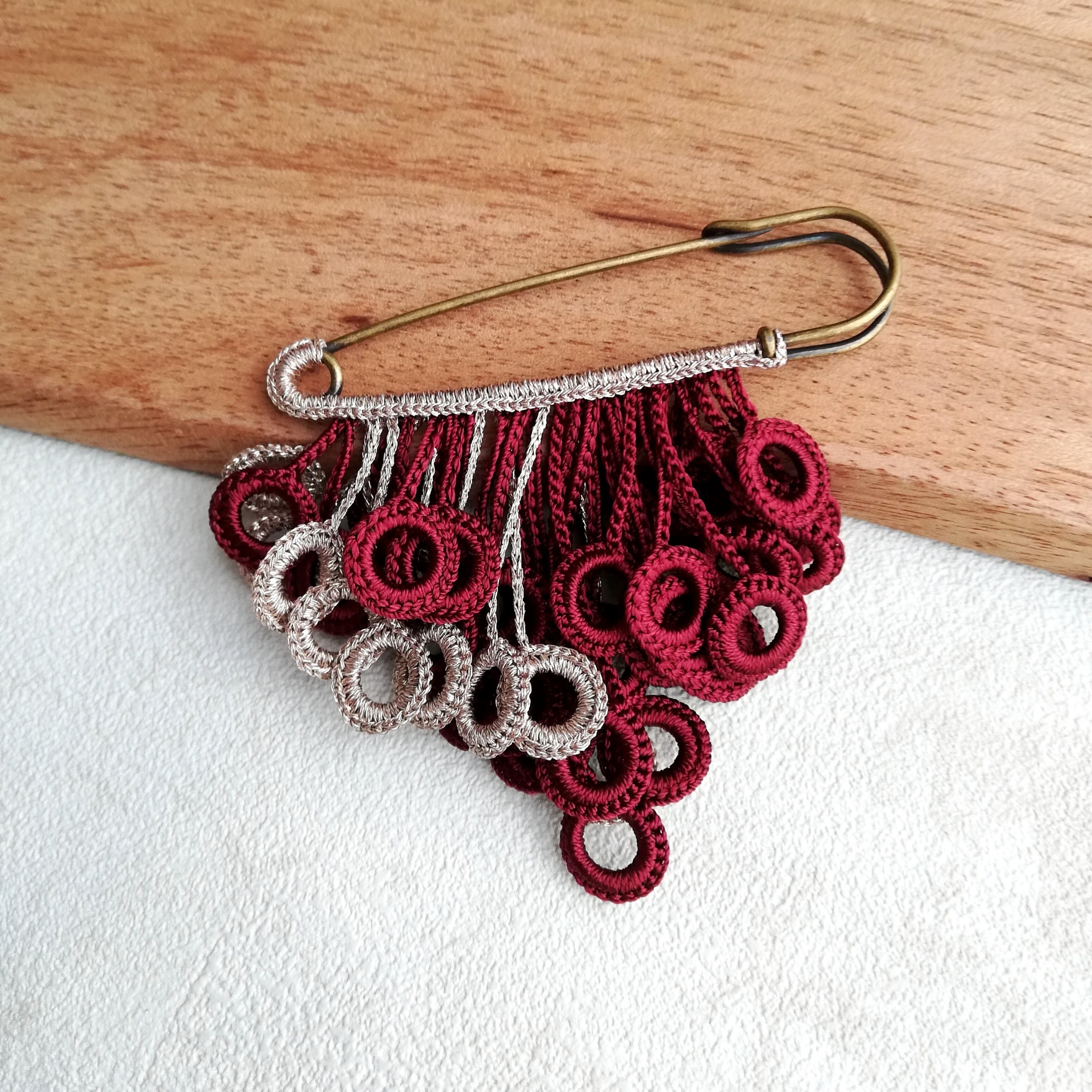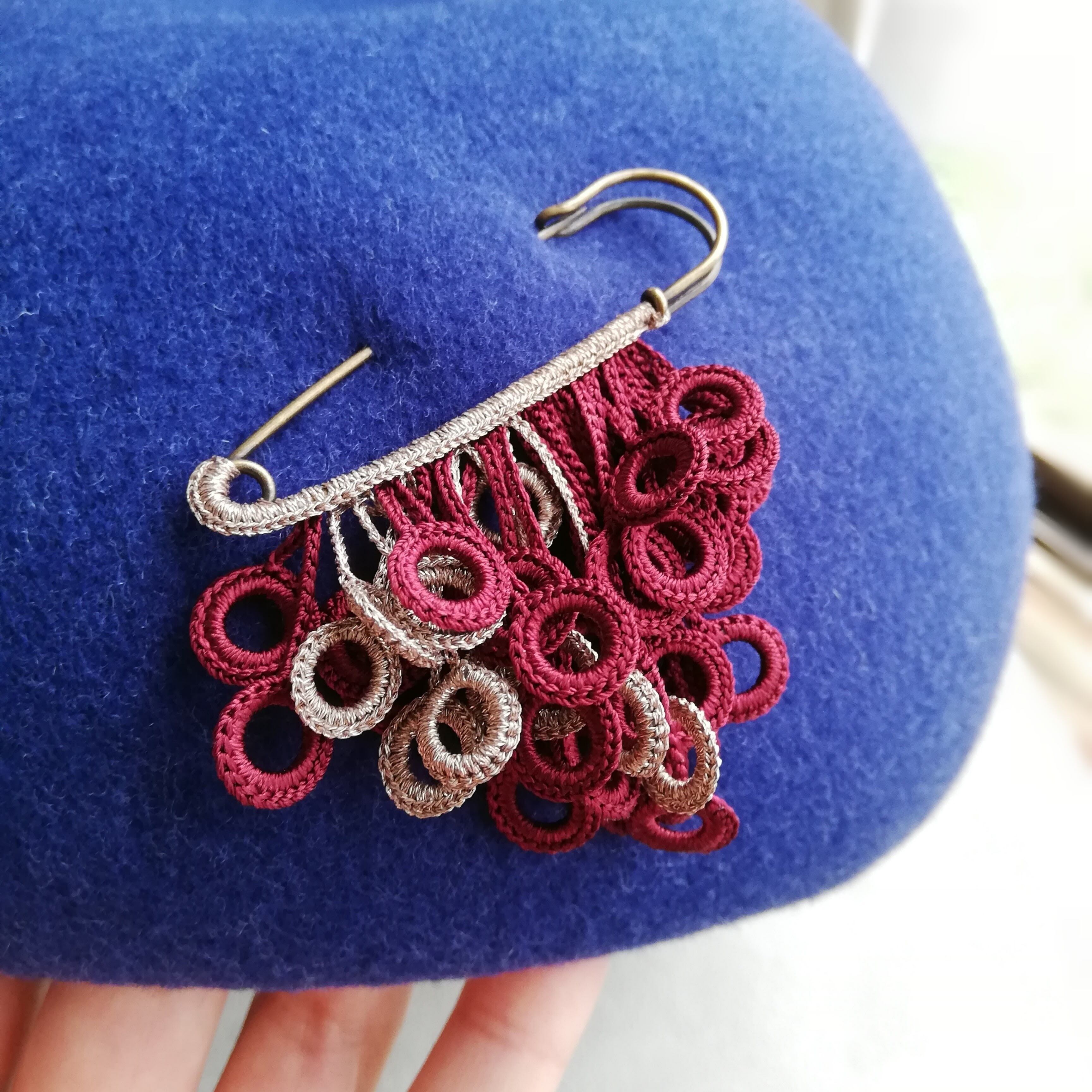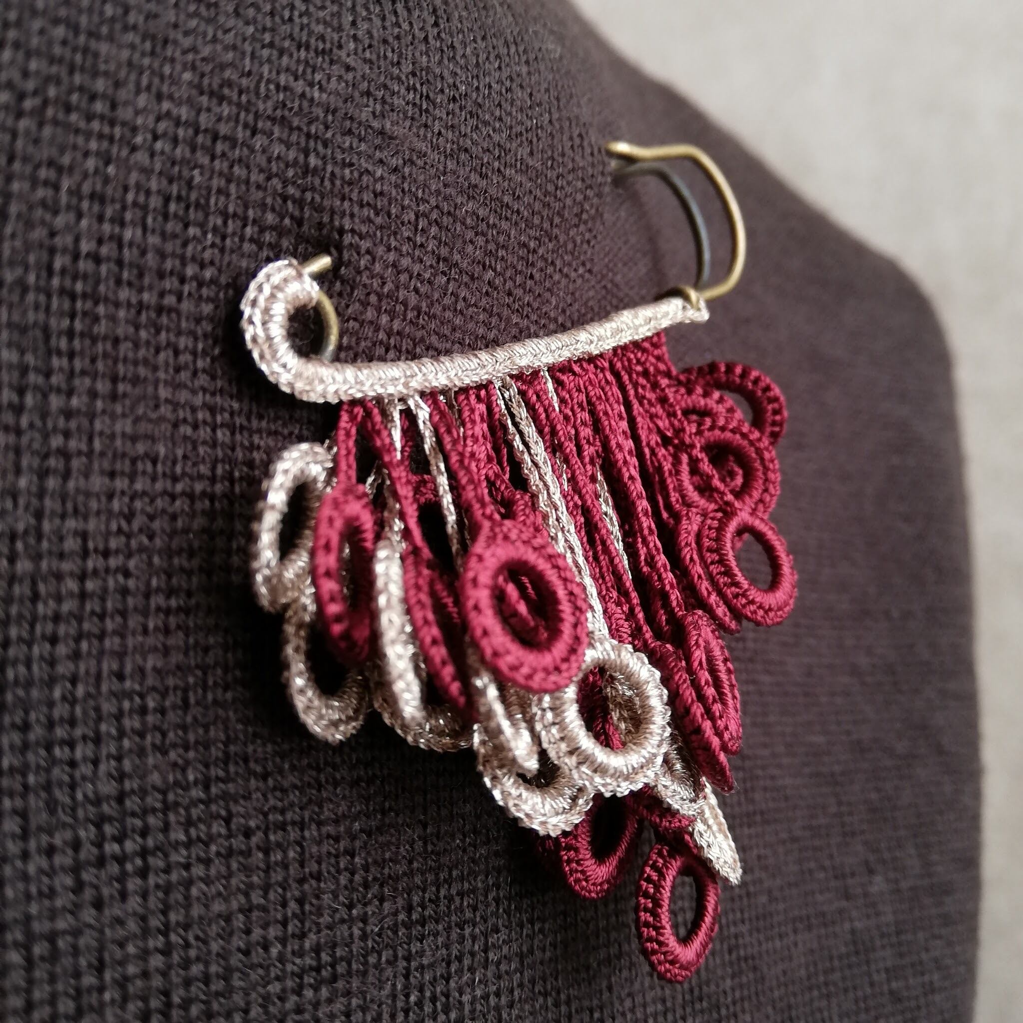 モチーフはブローチの軸にラメ糸で編み込んでいます。